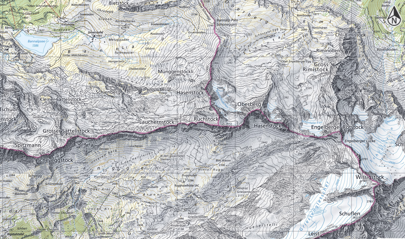 Route: Kreuzhütte – Räckholteren – Gruenboden – Bannalper Schonegg – P. 2266 – P. 2352 – P. 2392 – Rot Grätli – Engelberger Lücke – Wissigstock (2887) – Engelberger Lücke – P.2442 – Rugghubelhütte – Planggenstafel – Tüfelstein – Holzstein – Rigidalstafel – Ristis
